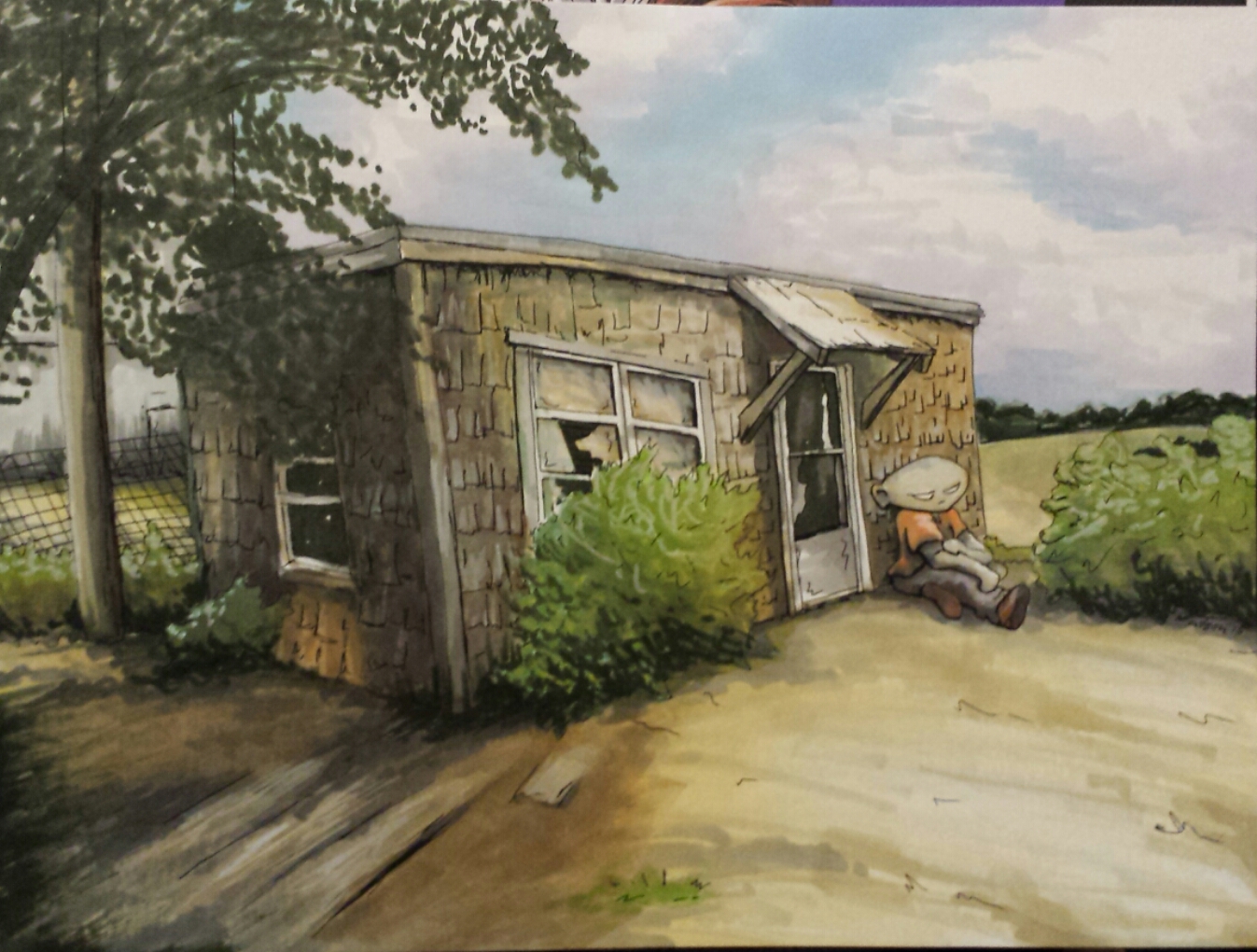 Here’s a scene where our main character rests outside a run down building that will function as shelter for the night. A little work and a family and he could call it home. For now though he keeps on traveling to see where the road takes him.