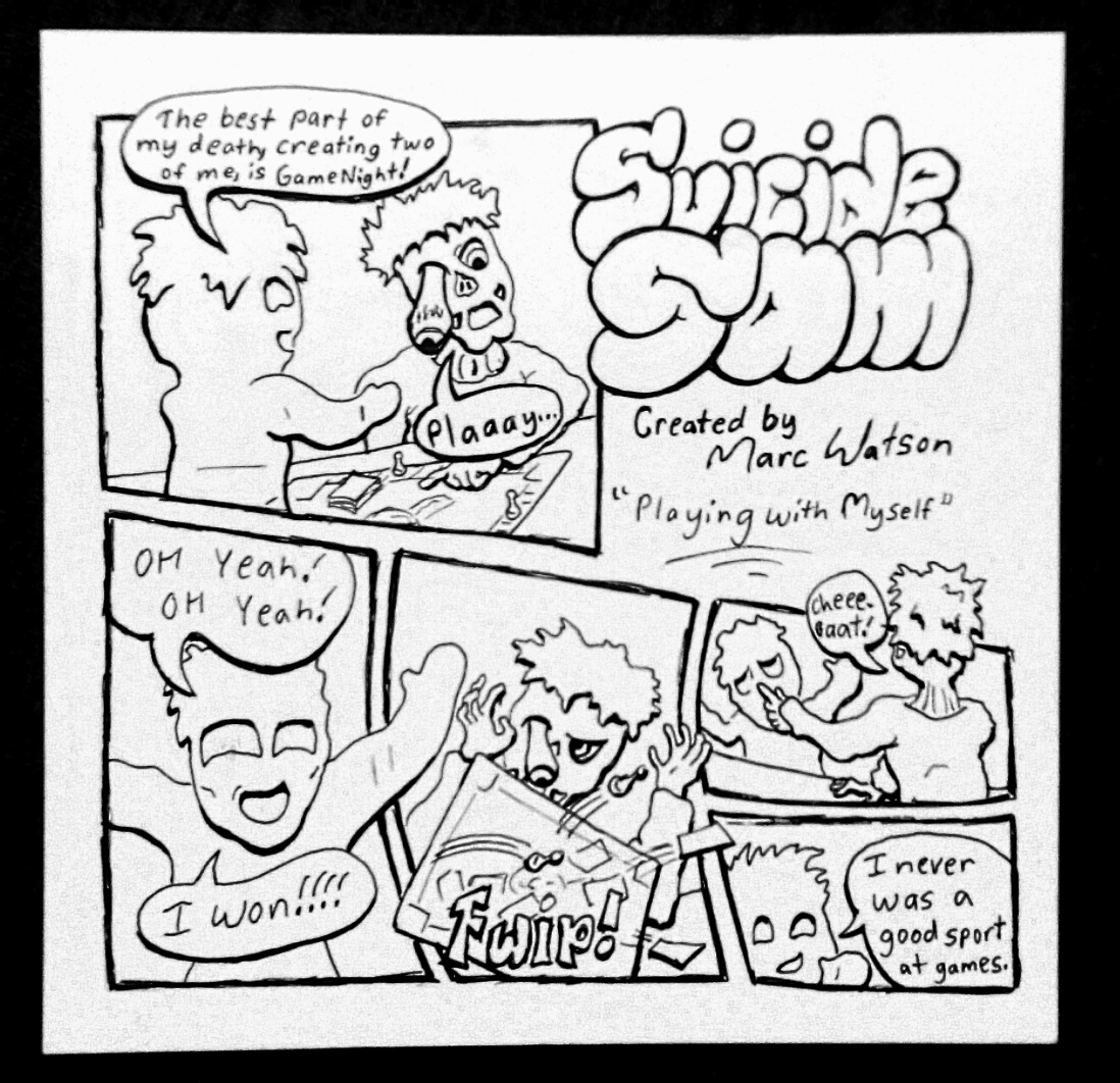 Suicide Sam started as a drawing prompt a friend of mine talked about last year in which it was to be a ghost and a zombie. It clicked in my head that what if someone committed suicide during a zombie apocalypse and could come back as both a zombie and a ghost. Thus Suicide Sam was born. I hope you guys like it. This is the first comic strip of the characters so it is a bit rough but anyways. You never are truly alone if you have yourself…