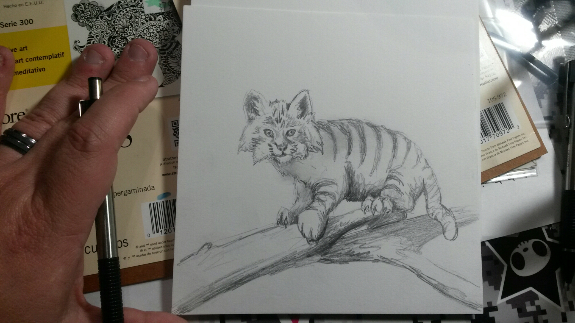 For quick sketches I always use the M301 .5mm Zebra. It’s versitisle cheap and moves easily in the hand for that quick shift of how you hole the pencil. The next thing I do is two things: I pull up references of what I want to draw (typically historical time line examples of character evolution) usually a simple Google search or pulling a book off my shelf and the second is I grab theses helpers.