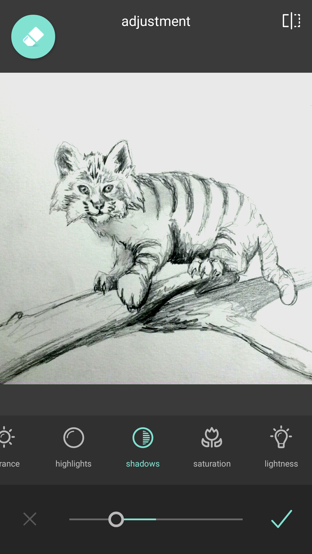 Okay now see that double circle second to left on the bottom? That is where all your standard image adjustments are that you expect in photoshop like apps. Under “adjustment” you will find the usual contrast, highlight, saturation, vibrance, saturation, exposure, etc. So first I turn the shadow dial left into the negative and the highlight to the right to positives. This widens the shading curve that was most likely minimized by your picture being taken on a phone in less than ideal lighting. I also play with contrast a little but you have to be careful here because this app likes to blow out detail quickly and you end up with over exposed images. So when you made all your adjustments hit the check mark on the right to save all the adjustments you just made.