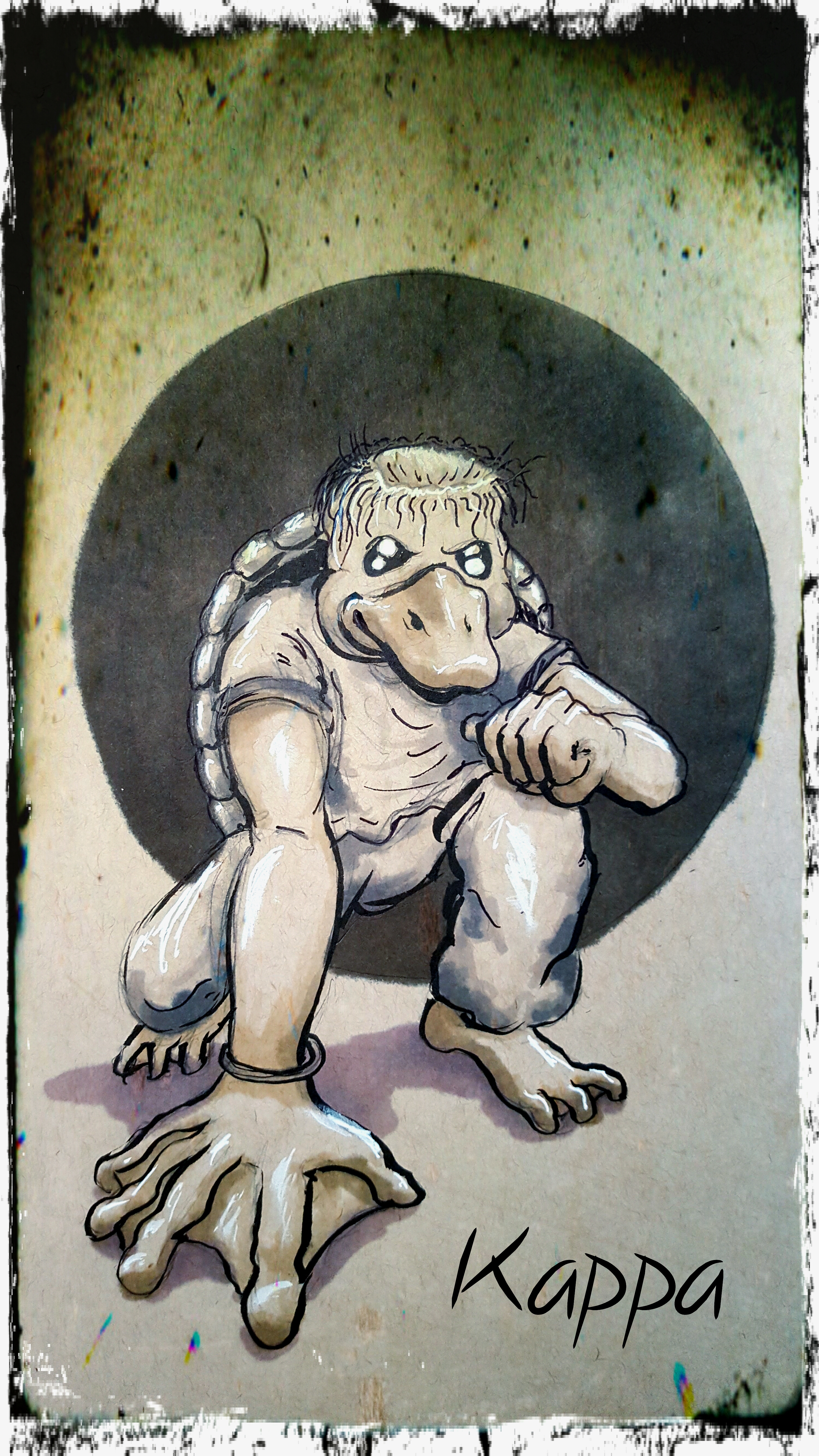 Those of you who loved Advent of the Archetype will hopefully love what I am planning for the second book. Obviously I would start running out of free rights classic tails so instead of going into the obscure and unrecognizable lore of the western world I have decided it is a much bigger world than that. So the second book will transition from Western tales to something parallel and different. I will take you to the long tradition of Japanese folklore and introduce you to the classic yokai. For now I will be presenting images as they are created to supplement while I finish my graduate work as well as chapter 3 of Meteors n milk. I won’t be posting the story bits and wiki postings for AotA like before until I have it hashed out entirely and give it to you one day at a time. So for now since you are amazing fans I am giving you peeks as to what you will see illustration wise. So I will leave you with this first promo teaser of a Kappa and I will see you on the next page…