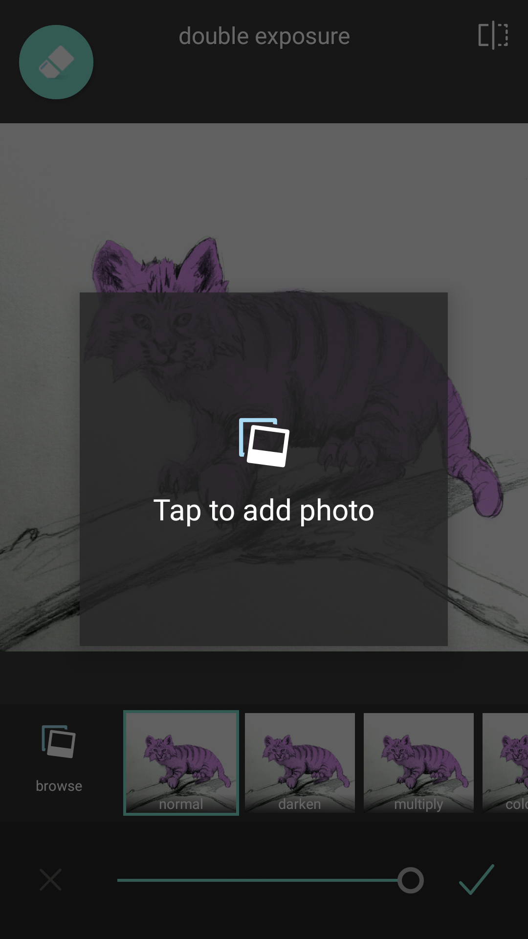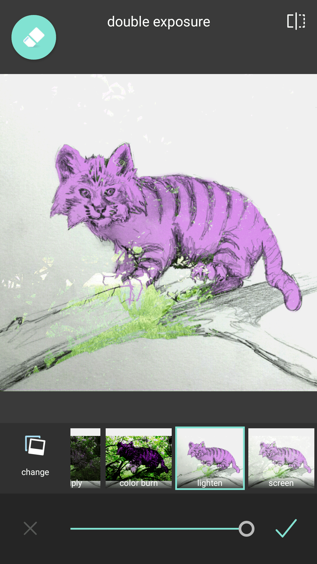 DO NOT CLICK THE CHECK BOX YET!!!! There are two important steps here. First the image is sizable, movable, and able to rotated by your standard pinch, pull, and drag finger gestures. Once you have it filling the screen the way you like it on to the second thing you need to do before anything (again do not hit the check yet). See all those options… normal, darken, multiply? Start scrolling through those.