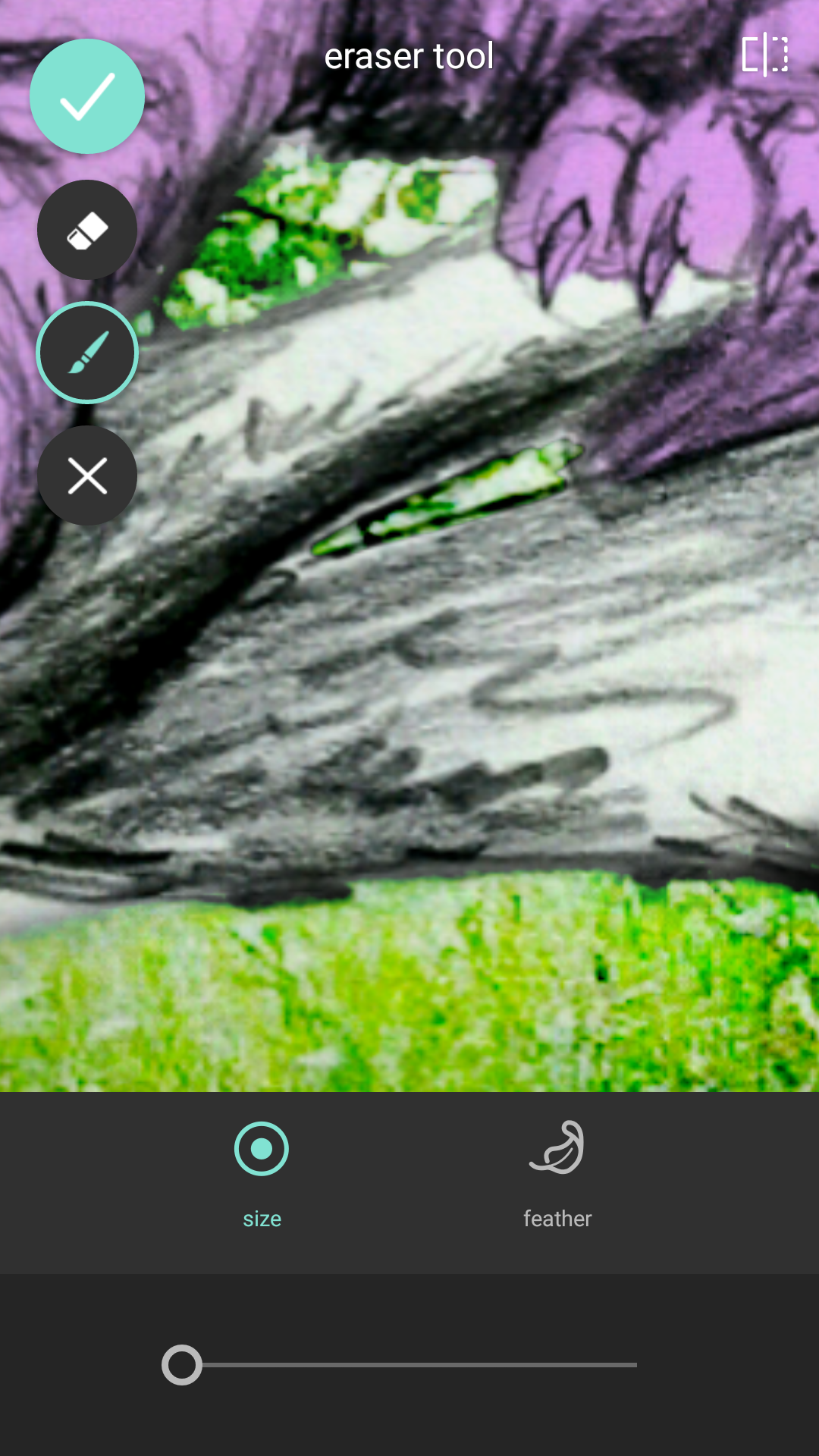 The size will be quite small and I keep feathering to a minimal as well because we are looking for a flat color basis for now. Now click on the paint brush. You will begin literally painting back on the filter you erased. It is like working with a scratch board. You can zoom in at this point by using the standard 2 finger punch and pull like in photos.