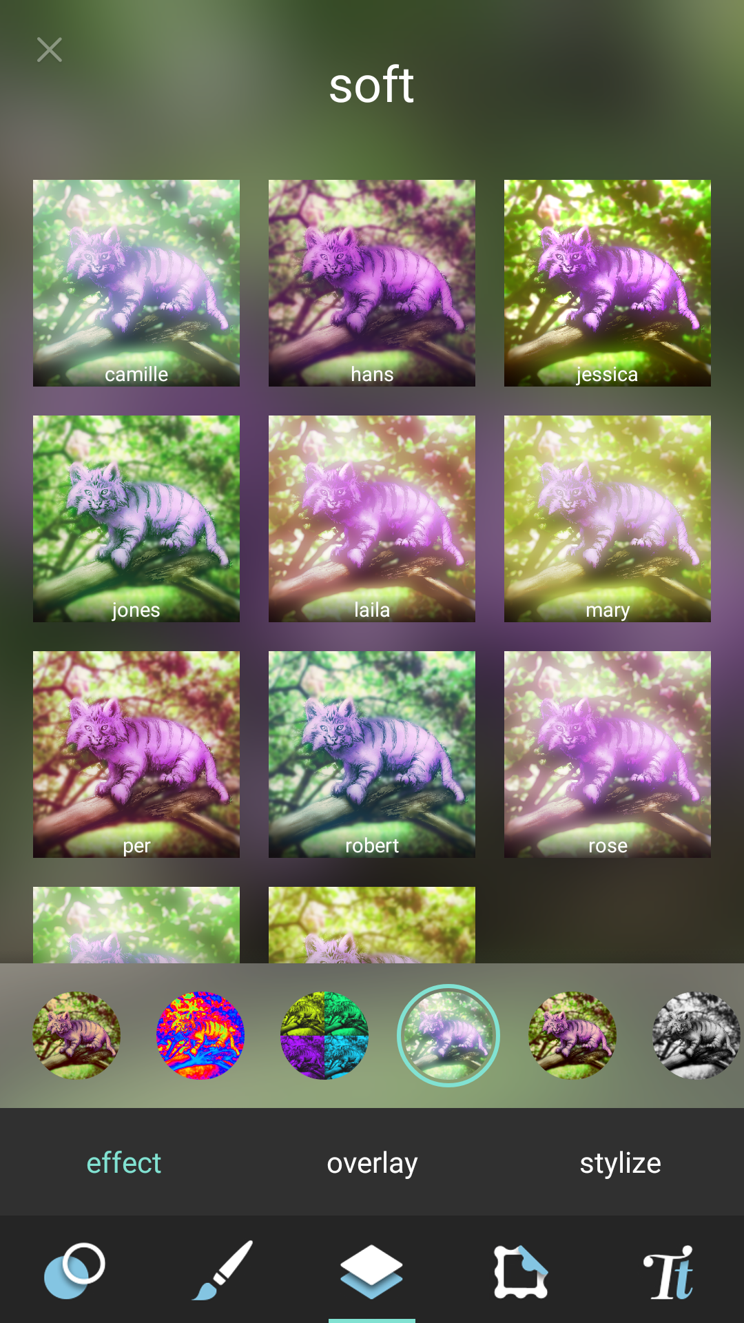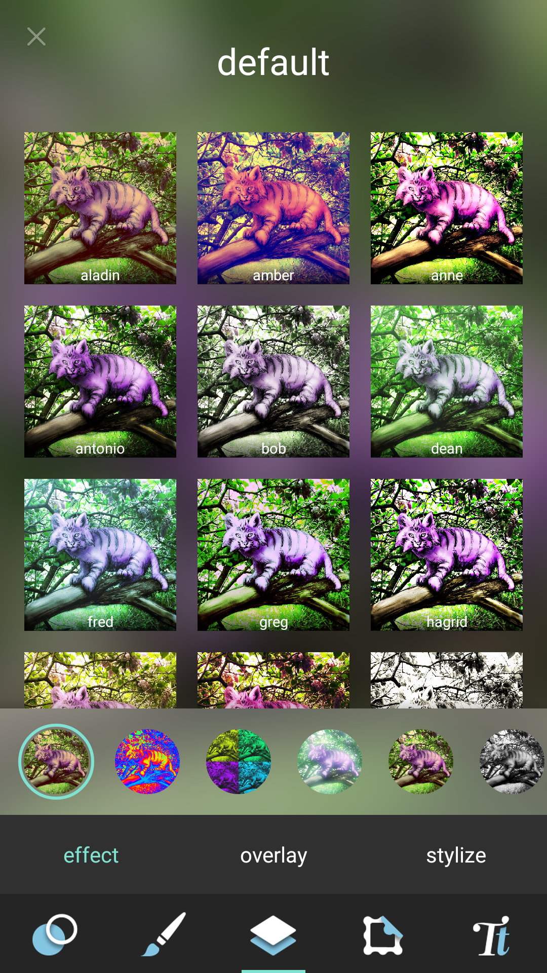 The double page icon (overlay) is what we want to click on next as seen above. It will automatically default to the default picture page and the submenu “effect”. Take a moment to scroll through this to get an idea of what section is. While the filters are programed to do the same to an image no matter what it is the effect may give you something you had not considered or give you an idea of direction.