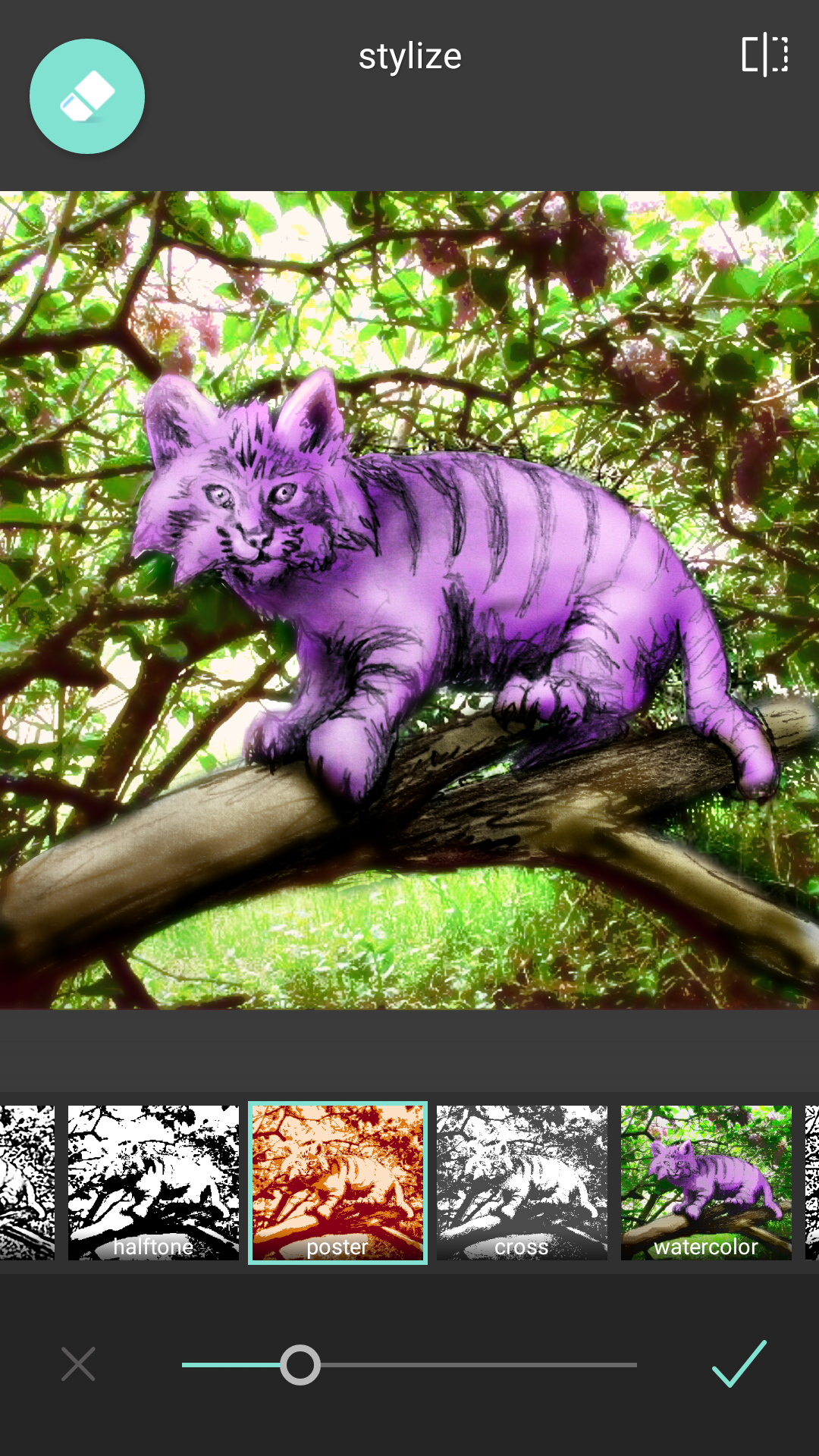 Once again I will erase out the cat and most of the branch because it is really the background that I want to shift to meet my needs. I erase the cat first because then I can switch between filters and see the ending effect better.