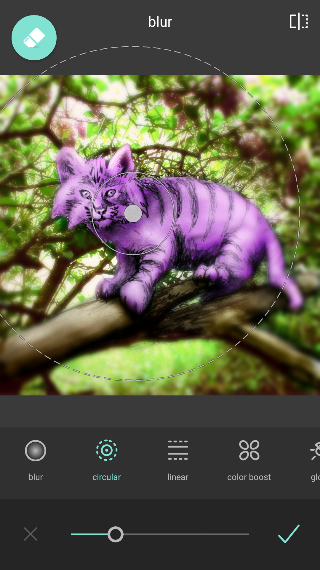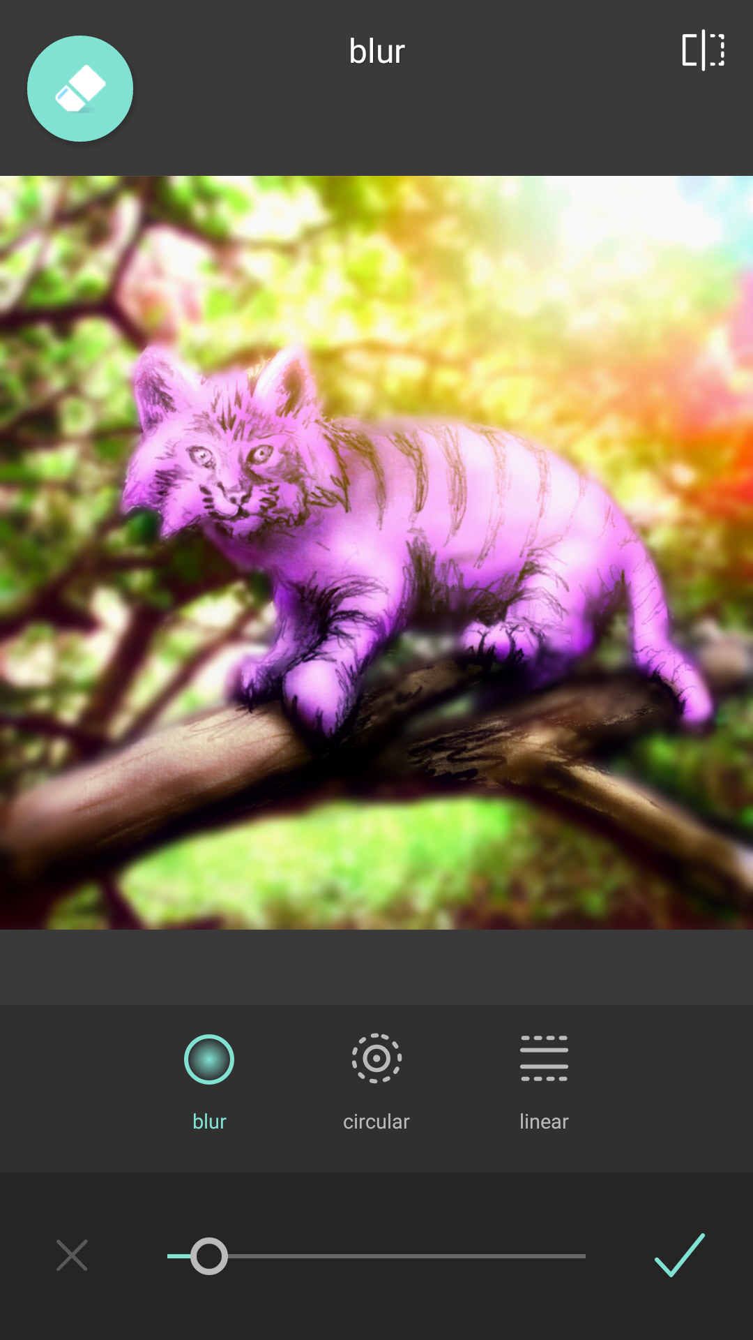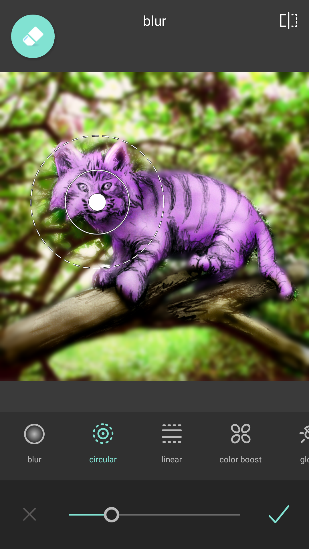 I switched it to circle so we can have more and optical perspective bluring. Like always erasing will be a neat truck here because we can choose to erase the effect on parts of the cat making him pull forward while still feeling like it exists in the space.
