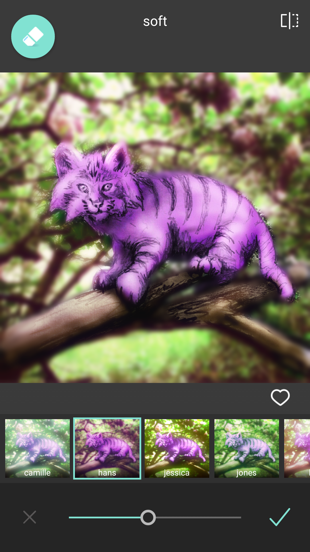 After painting I decided to switch to James instead of Kirsten because it looked more natural. Reminder: not only can you change the filter before hitting the check but you can also use the sliding bar to adjust translucency. Okay so now to do some thing about that flat feel. We are going to select the paintbrush in the bottom center.
