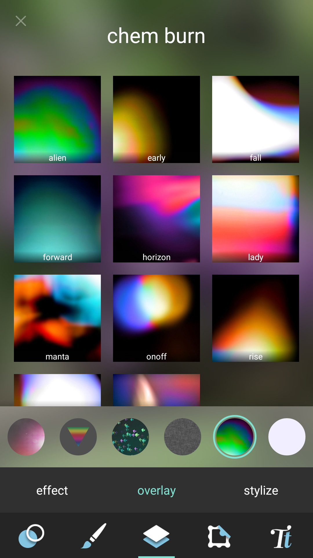 Next we go to layers > overlay > Chem burn. While these are to be a mimic of chemical mishaps in traditional exposure of photography they also can be used for amazing lighting effects.